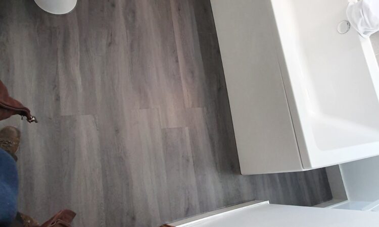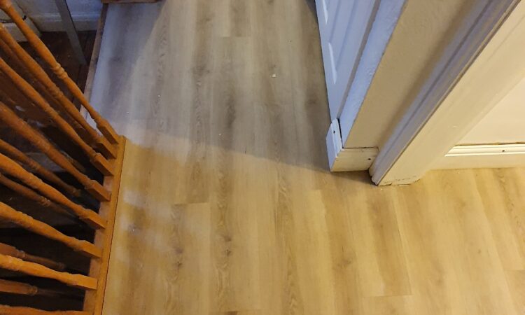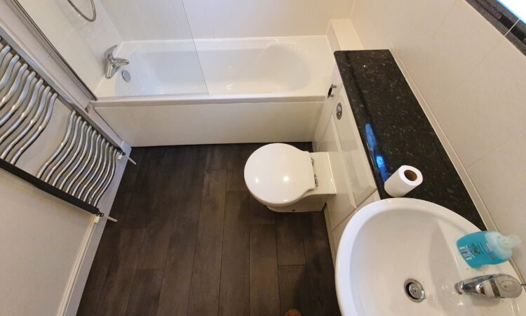 The floor was a vinyl click and was cut into the shape of the bathroom, we also helped the bathroom fitter install the bath and shower. Finally, we sourced a new matching door for the on-suite and hung it with matching ironmongery.