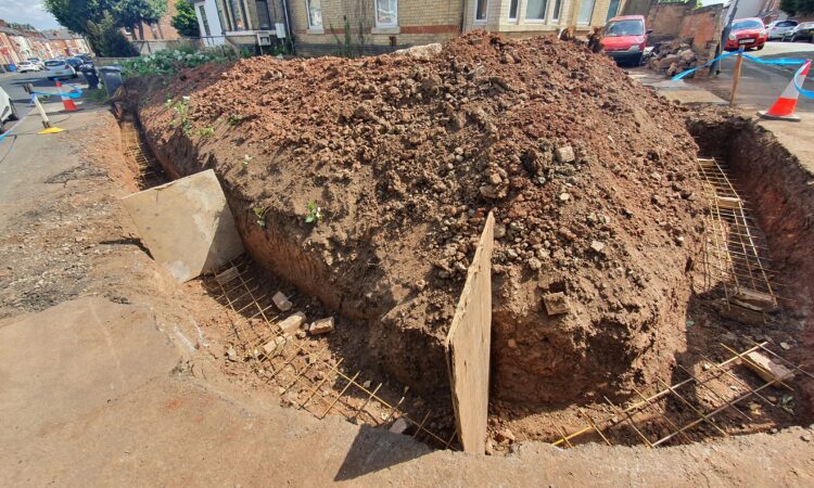 We built the shuttering in two sections, this allowed us to reuse the wood for the second section after the pour. we also laid waterproof sheets along the bottom to try and prevent rising damp. The slab also had a drain running through it, there were several ACO drains and a pipe that run the entire length of the slab.